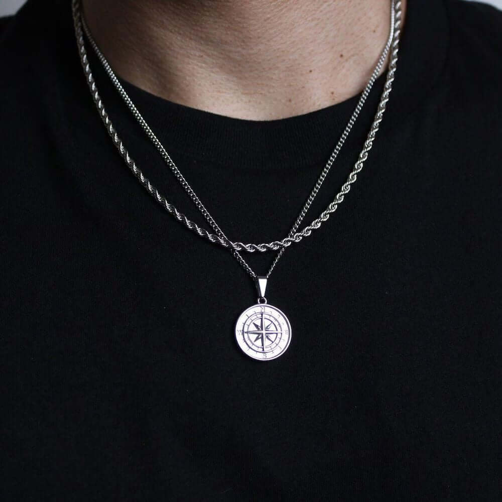 నార్త్ స్టార్ - స్టెయిన్లెస్ స్టీల్ రౌండ్ బాక్స్ చైన్ సెట్తో సిల్వర్ టోన్ లాకెట్టు - 24-అంగుళాల & 3 మిమీ రోప్ చైన్, యూరోపియన్ ట్రెండింగ్ స్టైల్
