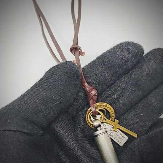 Designed for everyday wear, the pendant showcases a clean, streamlined bullet silhouette that adds an edge to any outfit. The pendant hangs from an adjustable pure leather cord, allowing you to tailor the length for a comfortable fit—from casual short looks to a longer, layered appearance. The two-toned combination of metal and rich brown leather creates a rugged yet refined look that pairs perfectly with denim, tees, jackets, or smart-casual ensembles.