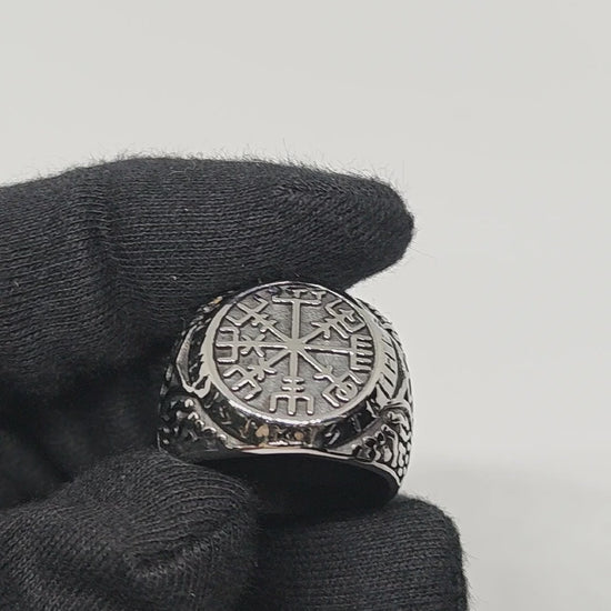 On the face, a circular Nordic motif with eight-spoked symmetry sits at the center, surrounded by antiqued runic engravings that echo ancient tales of fate. The band features intricate knotwork and geometric accents along the sides, creating a cohesive, statement-making profile from every angle.