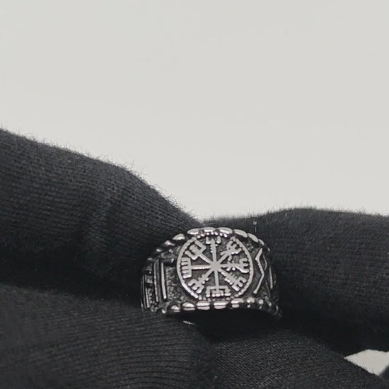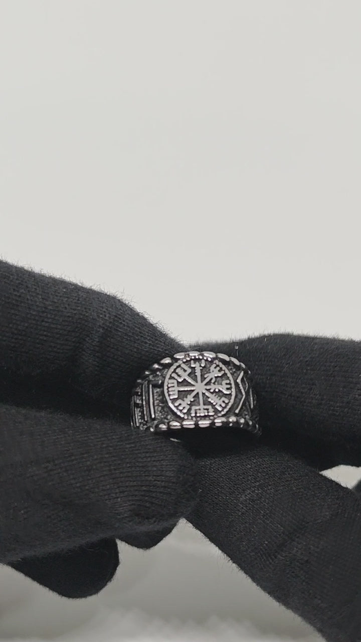 Rendered in enduring stainless steel, the ring showcases a dark, textured backdrop that makes the bright relief of the Vegvisir leap to life. Intricate runic-inspired motifs radiate from the center, while a sculpted edge adds a touch of medieval grandeur. The result is a ring that exudes regal confidence and contemporary edge in equal measure.