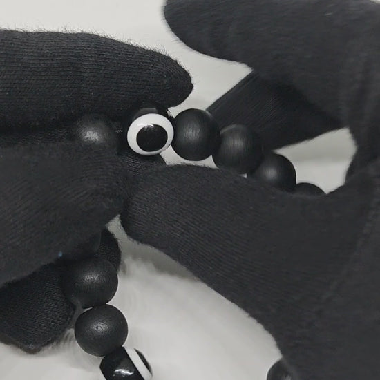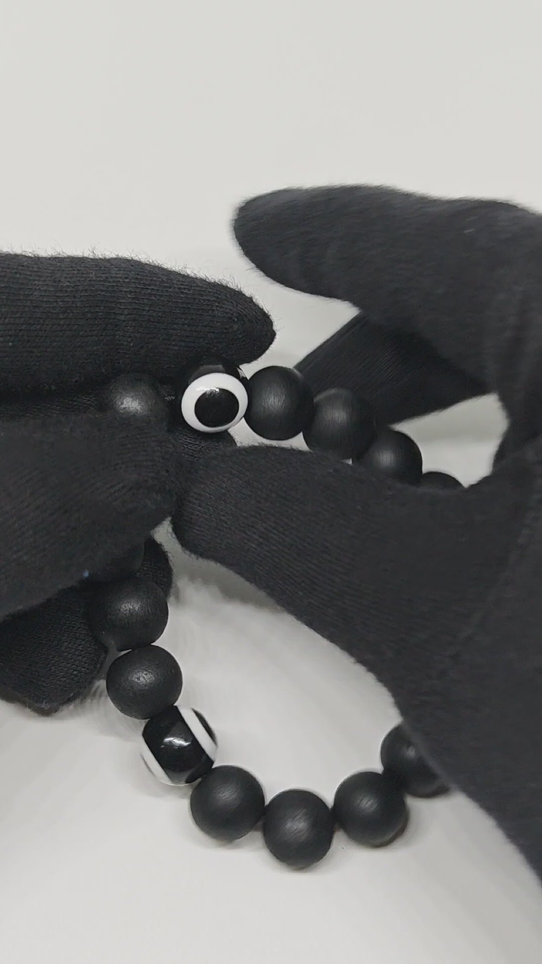 SHADOW EVIL EYE is a bold, minimalist bracelet crafted with 12mm matte-black beads that deliver a clean, modern silhouette. Interspersed with striking eye accents, this piece blends mysterious charm with everyday versatility, making it a standout addition to any wardrobe.