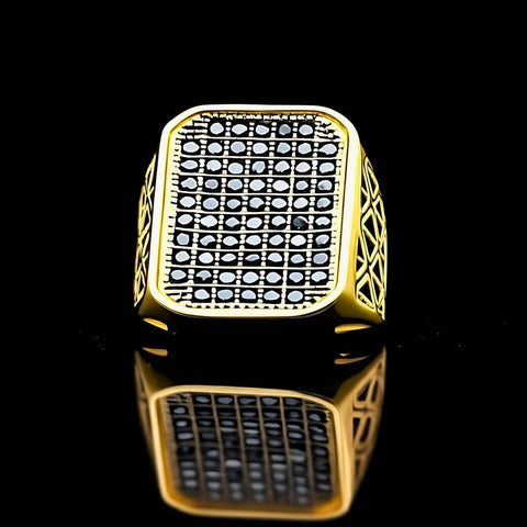 Featuring a luxurious gold-plated finish, the ring's square top is adorned with a captivating grid of black cubic zirconia stones, creating a high-impact, masculine aesthetic. The geometric side cutouts add a contemporary touch, elevating the overall design and making it perfect for the modern, confident man.