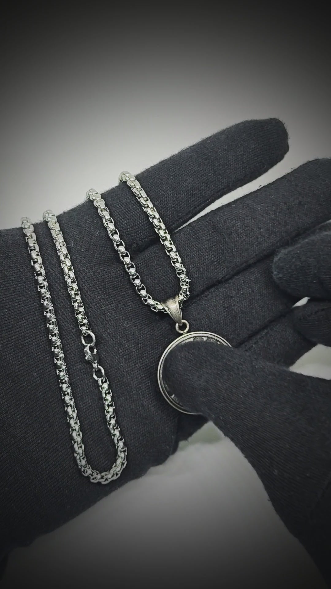 Introducing MYSTIC HOUR, a bold, timepiece-inspired pendant that brings a focal point of style to every outfit. The 30mm round pendant hangs from a substantial 24-inch round box chain with a 5mm width, delivering a confident, masculine silhouette that complements both casual and formal looks.