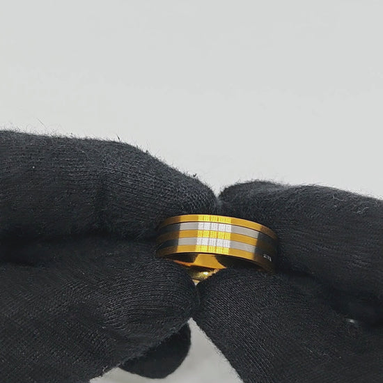 Across the band, three precise stripes create a clean, modern rhythm around the finger. The contrast between the steel base and the gold-toned accents delivers a sophisticated, contemporary look that pairs effortlessly with business attire, casual denim, or formal wear. This ring isn’t just an accessory; it’s a statement of style and confidence.