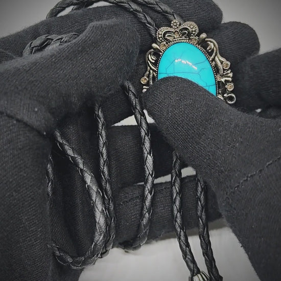 Meet the Turquoise Horizon Bolo — a bold, masculine pendant designed to elevate everyday style with rugged charm and refined detail. This 1.8-inch centerpiece is crafted from pure stainless steel, delivering lasting shine and enduring durability, paired with a supple, adjustable black leather cord. The focal turquoise cabochon sits proudly in an ornate, vintage-inspired bezel, while delicate filigree surrounds the stone to create a timeless, heirloom look that still feels modern for today’s wardrobe.