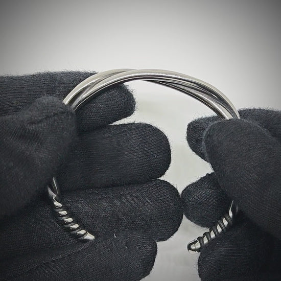 The twisted double‑band silhouette catches light from every angle, adding a modern, masculine edge to any look. Its open cuff design delivers an adjustable, comfortable fit while preserving a sleek, streamlined profile.