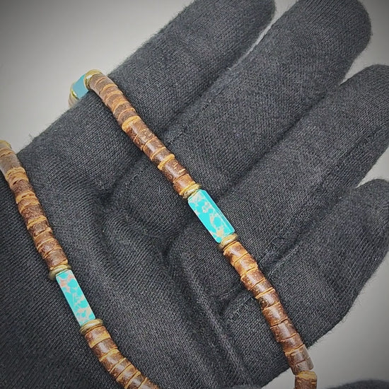 - Tribal-inspired pattern combines smooth turquoise segments with rich brown spacers and gold-toned accents for a rugged, masculine appeal.