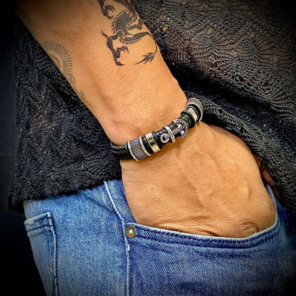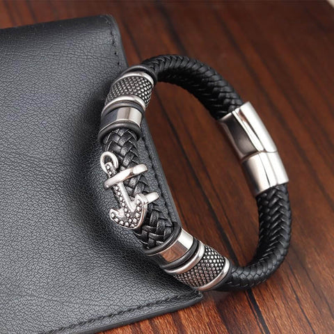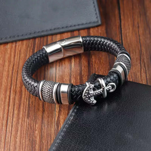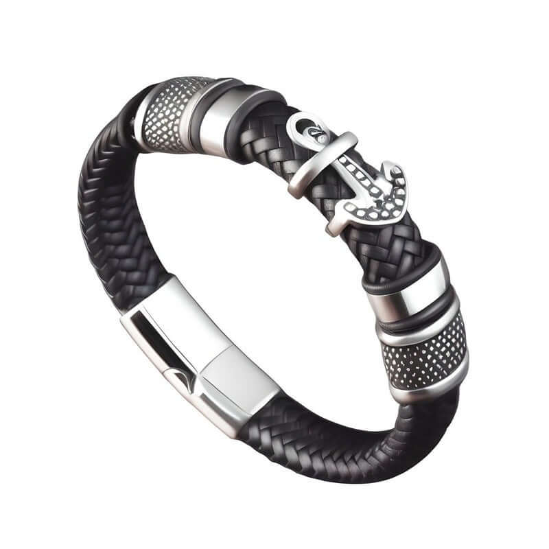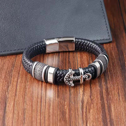 ANCHOR KRAKEN BLACK - Genuine Leather Braided Bracelet with Stainless Steel Magnetic Buckle for Men & Boys (8 inch)