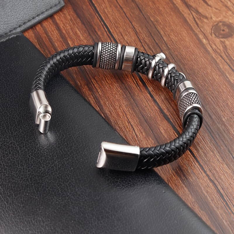 స్టార్రీ ట్వైన్ బ్లాక్ - పురుషులు & అబ్బాయిల కోసం స్టెయిన్లెస్ స్టీల్ క్లాస్ప్ మాగ్నెటిక్ బకిల్తో కూడిన అమెరికన్ స్టైల్ జెన్యూన్ అల్లిన లెదర్ బ్రాస్లెట్ (8 అంగుళాలు)