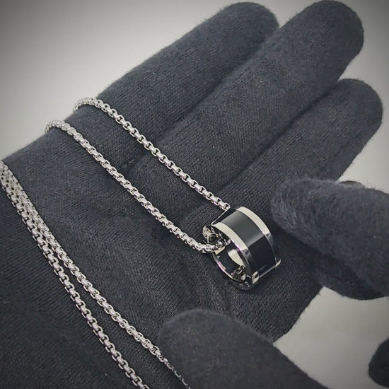 The 21mm pendant commands attention with a compact yet impactful silhouette. Crafted from durable titanium steel, it boasts a sleek black finish that resists scratches and maintains its bold look day after day. Its cylinder-inspired form is accented with subtle metallic bands, delivering a modern, masculine aesthetic that pairs seamlessly with casual and formal outfits alike.