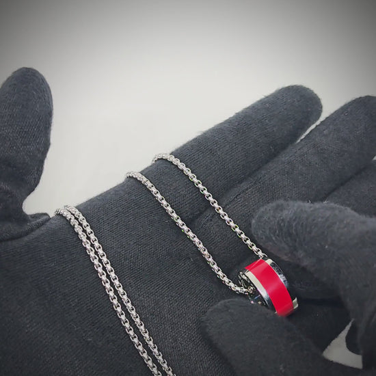 Designed for men and boys who appreciate clean lines and modern edge, this pendant pairs a vivid red core with polished titanium steel accents for a look that stands out in any setting—from casual street style to smart-casual moments.