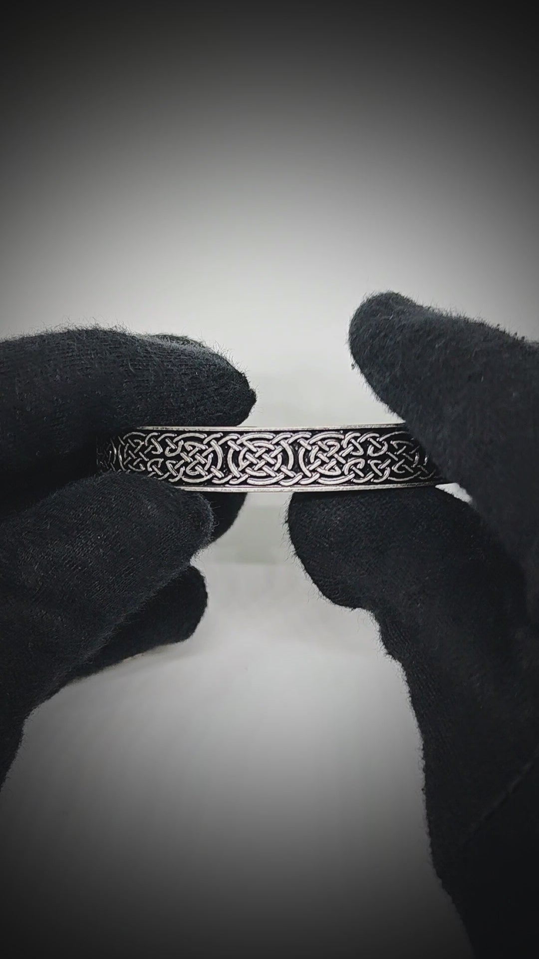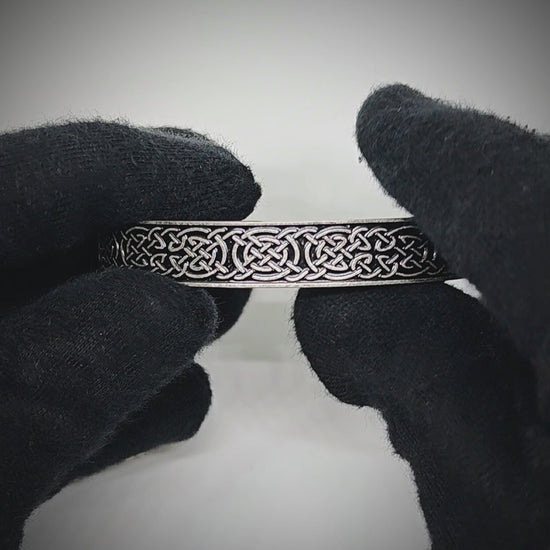 The bold 12mm width gives a confident presence on the wrist, while the Celtic knot motif runs along the band with a tactile, relief-style texture. From every angle, the knot design catches the light, revealing depth and craftsmanship that elevate even simple outfits into something sharper.