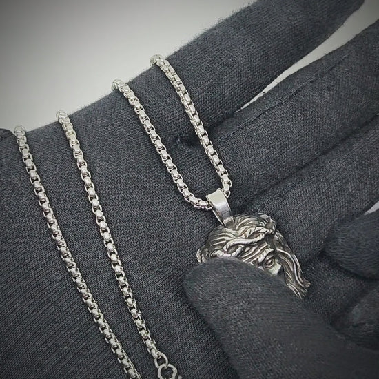 Carved with a regal, crowned facial motif, the pendant captures a sense of reverence and power. The 26mm pendant is proportioned to draw attention without overwhelming, making it an ideal centerpiece for any neckline. Paired with a robust 24-inch round box chain at 5mm width, this necklace offers a balanced silhouette that sits comfortably on the chest while remaining noticeable enough to elevate your look.
