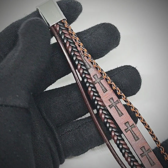 The bracelet features a layered, multi‑band design that adds texture and depth to your wrist. A braided band sits alongside a wider, smooth strap adorned with a subtle cross motif, creating a distinctive, masculine silhouette that pairs perfectly with denim, leather jackets, or smart‑casual attire.