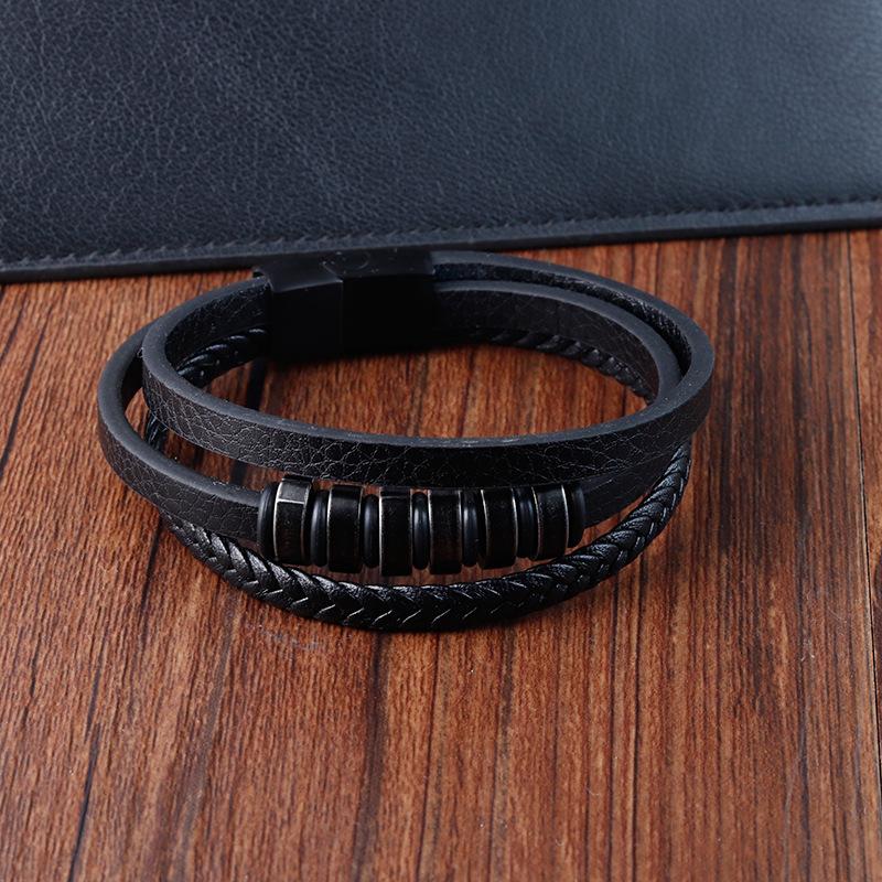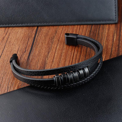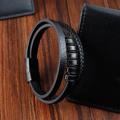 NOIR BRAID BLACK - Genuine Leather Multi-Layer Braided Bracelet with Stainless Steel Magnetic Buckle for Men & Boys (8 inch)