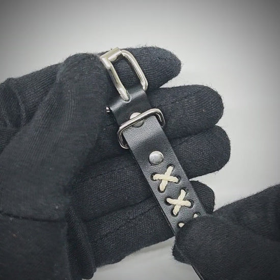 Featuring a wide, tactile leather strap and distinctive cross-stitch detailing, NOMAD X commands attention with a modern, minimalist aesthetic. The white cross stitches traverse the length of the band, creating a striking contrast against the deep black leather.