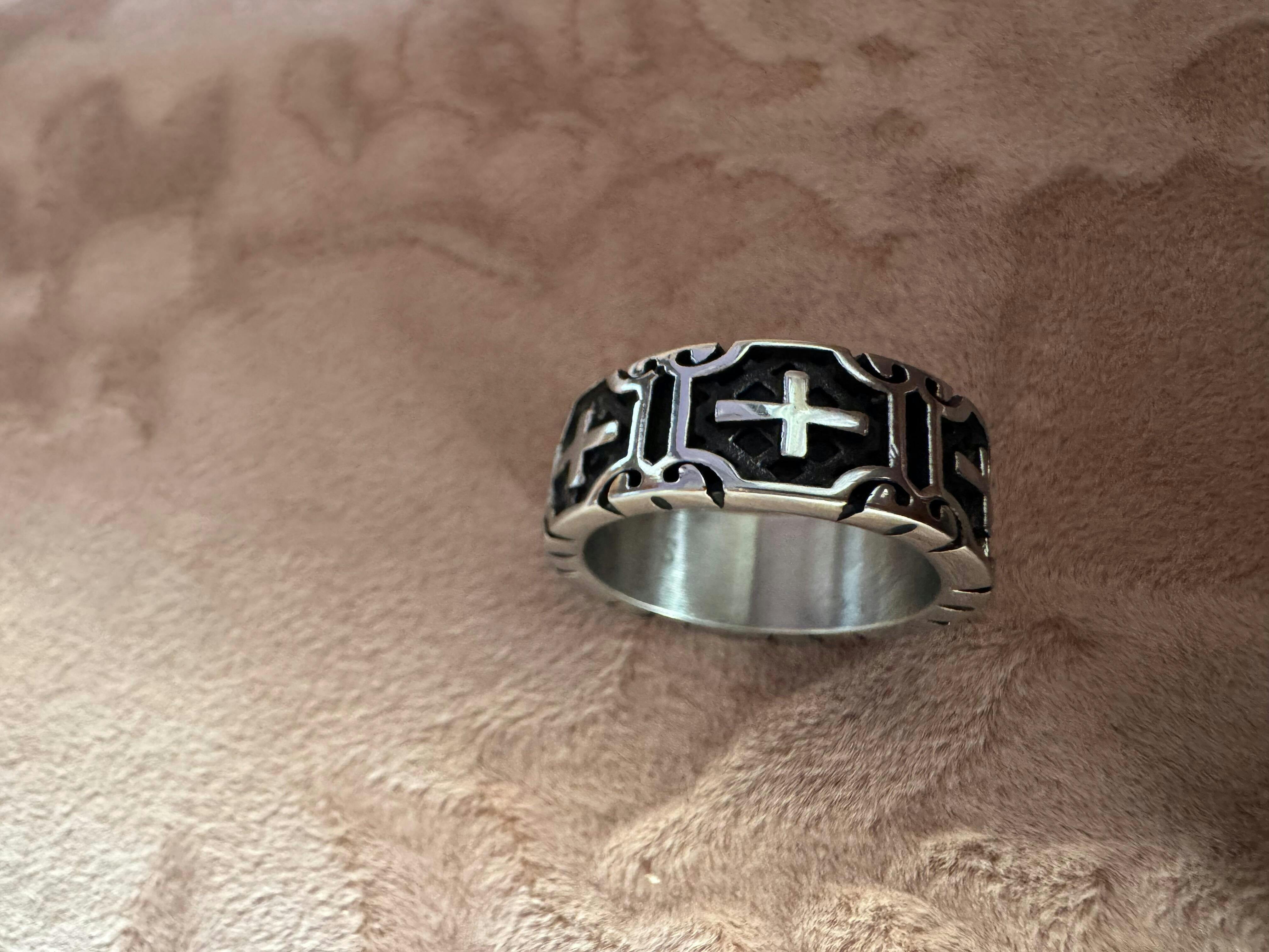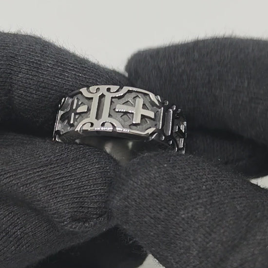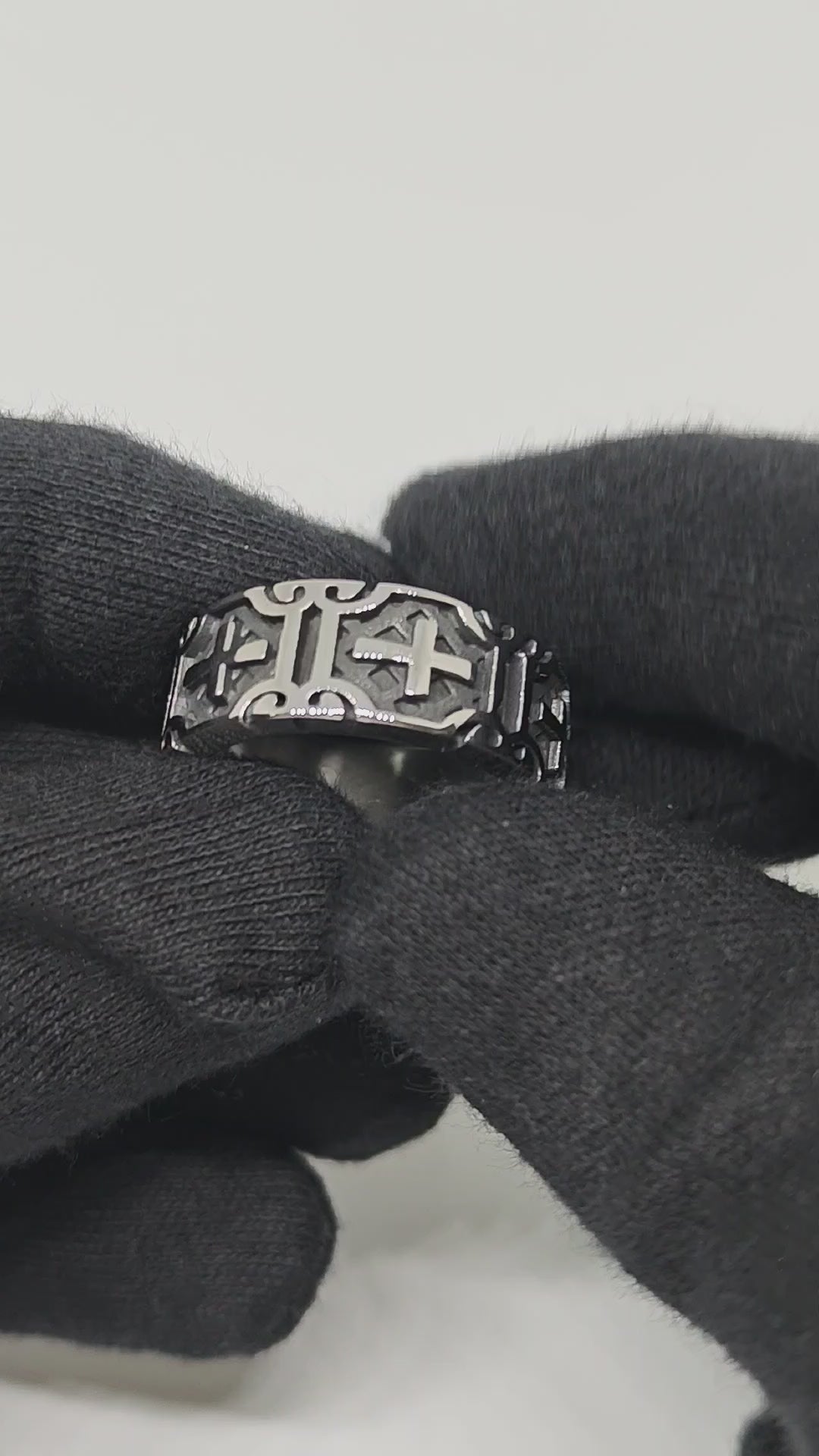 From the first glance, this men’s ring makes a powerful impact. The wide band features a dramatic openwork face where cross motifs rise within a shield-like frame. A dark backdrop creates contrast with bright steel elements, giving the piece a commanding, museum-worthy presence from every angle.