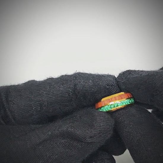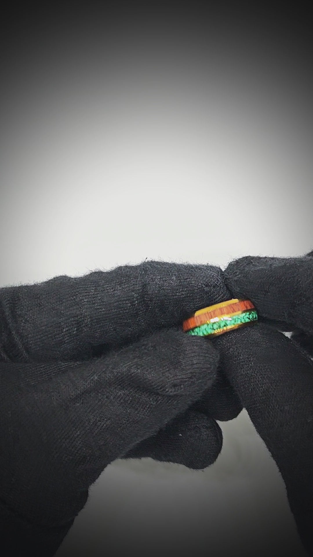 The ring showcases a striking multi-band silhouette that instantly elevates any look. Rich emerald-green inlay meets warm, earthy accents and gleaming gold borders, creating a sophisticated, museum-worthy aesthetic from every angle.