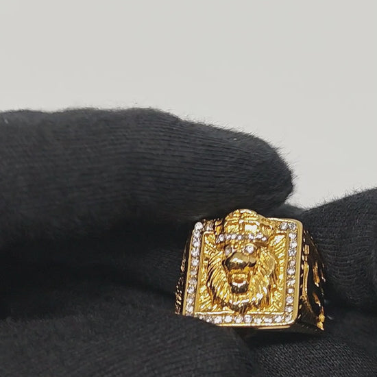 The centerpiece is a square bezel featuring a meticulously sculpted Maharaja lion—crowned, dignified, and ready to lead the room. The lion’s fierce expression is framed by a halo of sparkling crystals, capturing light from every angle and adding a touch of opulent glamour without overpowering the dramatic focal point. Ornate detailing along the band echoes royal artistry, ensuring this ring makes a lasting impression from every perspective.