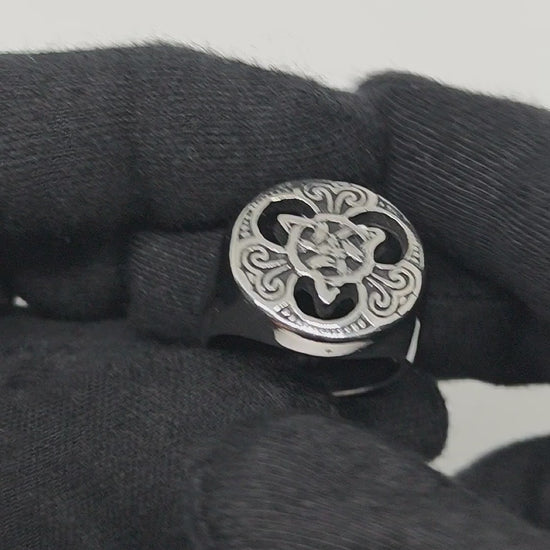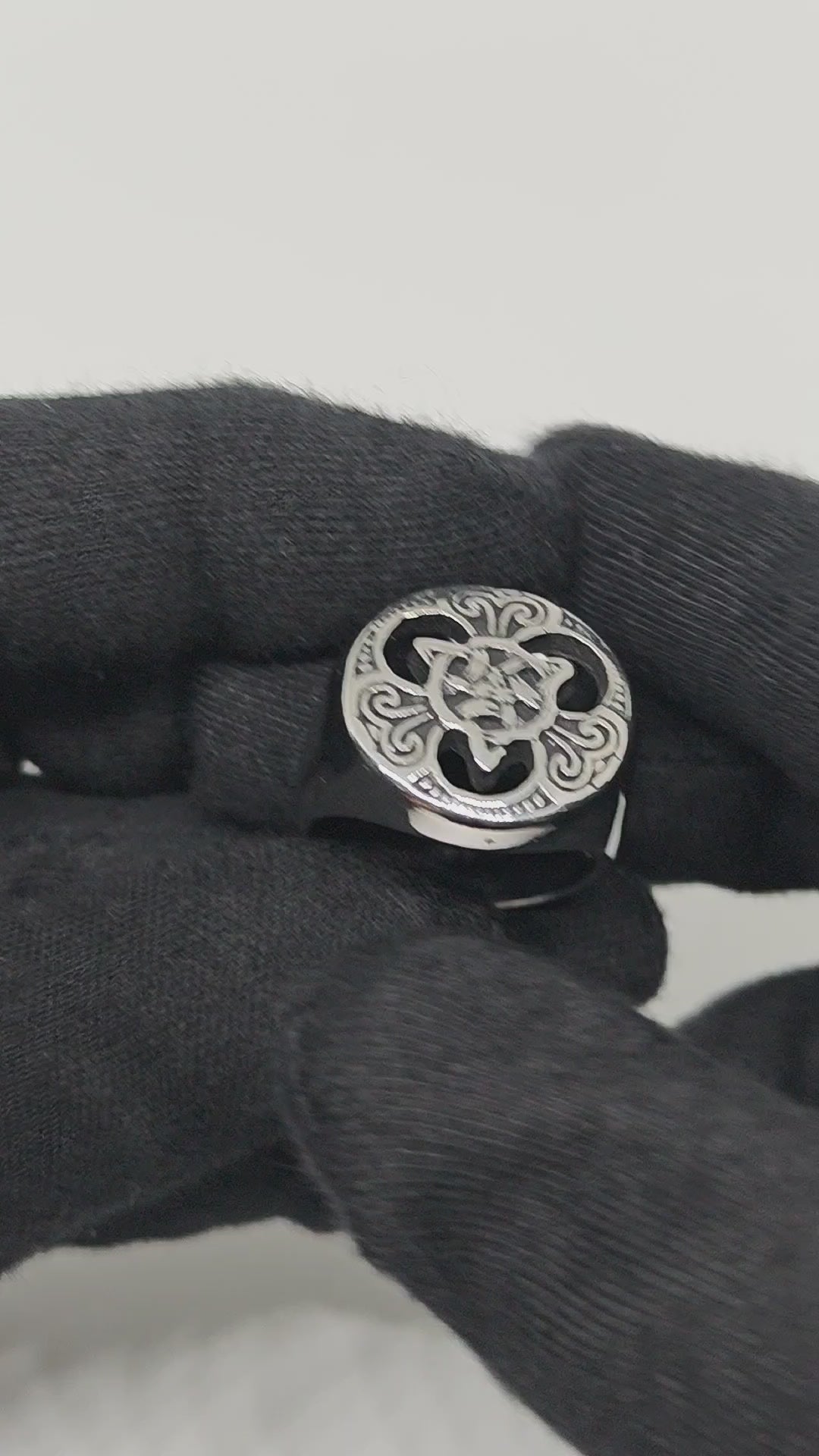 - Design: Circular signet top featuring a mythic guardian motif encircled by ornate scrollwork.
