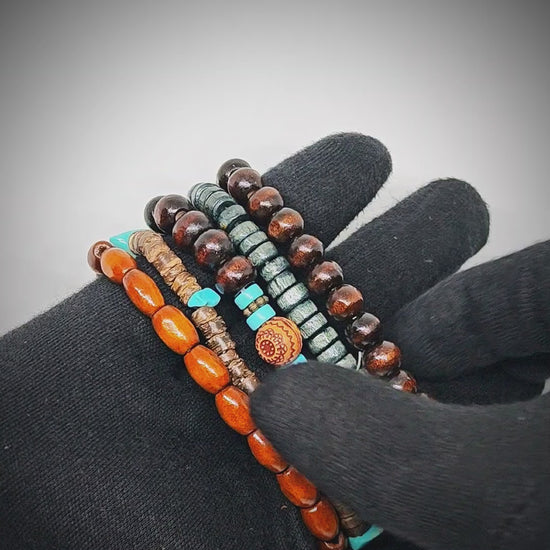 Each bracelet is crafted from genuine brown leather with a tactile texture and a warm patina that only improves with wear. The beads and accents add subtle contrast—think earthy wood tones and light turquoise highlights—giving the set a distinctive, masculine character.