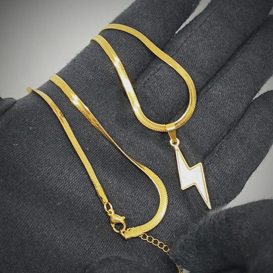Designed to captivate, the pendant features a sharp lightning silhouette with a gleaming gold-tone surround and a crisp white inlay. Its clean lines and luminous finish make it a versatile accessory that effortlessly elevates everything from casual tees to smarter outfits.