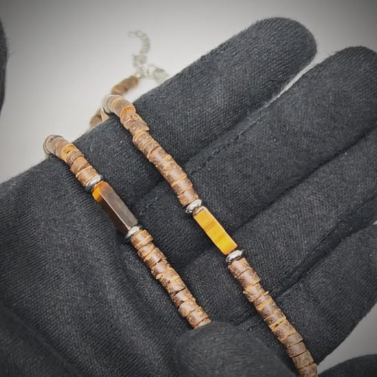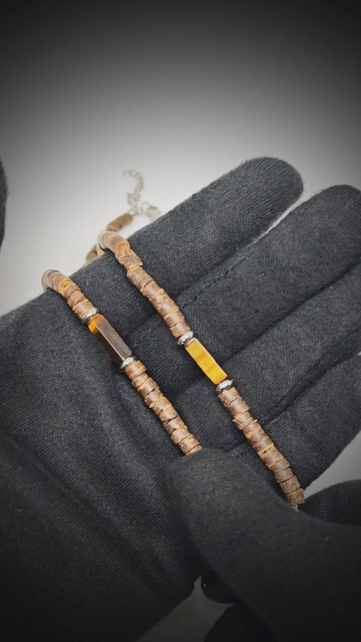 The star of the design is the Tiger Eye 6 mm beads, celebrated for their chatoyance—the shimmering bands of light that glide across the surface as you move. Complemented by earthy brown seed beads and punctuated with sleek silver-toned spacers, the necklace creates a balanced, tribal-inspired silhouette that feels both bold and refined.