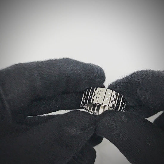 The ring features a distinctive block-link motif that circles the entire band, catching the light from every angle and adding subtle texture to any outfit.